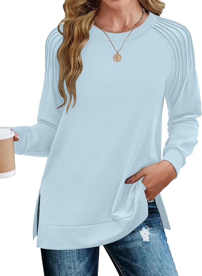 Tunic Tops for Women 2024 Fall Long Sleeve Shirts Dressy Casual Crewneck Pleated Cute Tops Side Split Sweatshirts