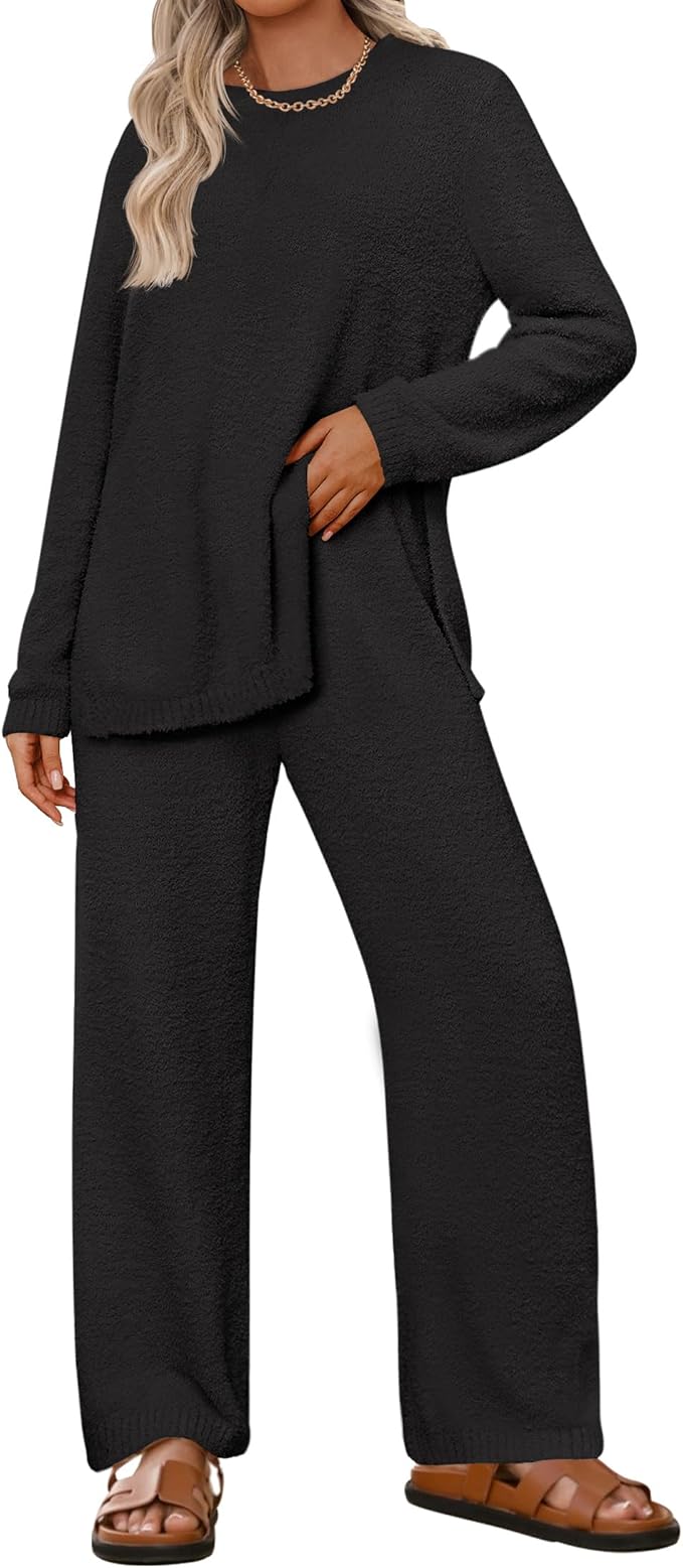 Women's Fuzzy Fleece Lounge Sets 2 Piece Loungewear Outfits Oversized Tunic Sweater Wide Leg Pants Pajama Sets